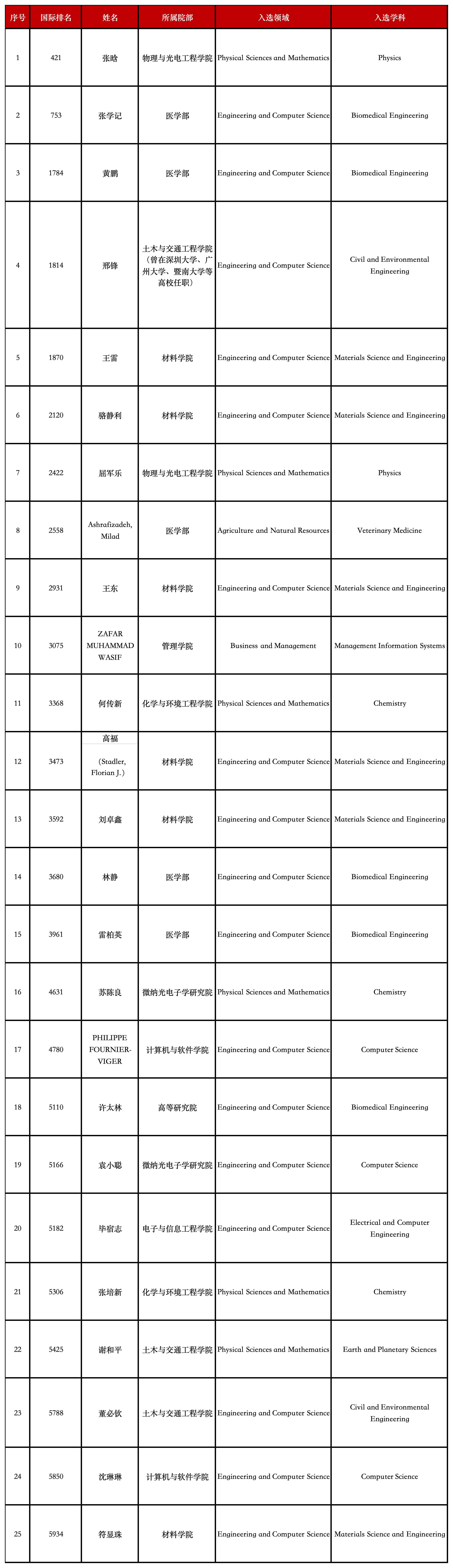 據統計,內地共有285位學者進入終身榜單,1596位學者入選近五年榜單。按榜單提供的機構顯示,深圳大學有25位學者入選近五年榜,入選人數位居近五年榜中內地高校第18名。具體名單如下: