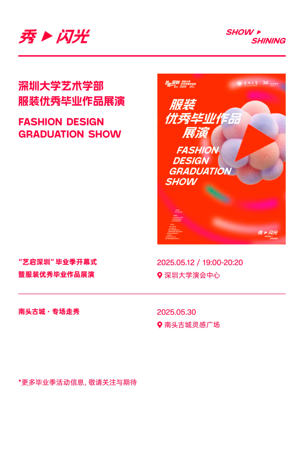 據(jù)悉,2025年深圳大學藝術(shù)學部畢業(yè)季以“藝啟深圳”為名,寓意青年藝術(shù)力量與先鋒之城相遇,開啟藝術(shù)與城市的深度對話。本屆畢業(yè)季匯聚學部下設三大學院十二個專業(yè)畢業(yè)生,以藝術(shù)與科技融合、跨學科交叉為特點,共同呈現(xiàn)“展”“演”“秀”三大板塊的精彩內(nèi)容,涵蓋美術(shù)展、設計展、服裝走秀、音樂會、舞蹈演出、戲劇專場等豐富形式,多維度展示青年創(chuàng)作者們以創(chuàng)意賦能城市、以藝術(shù)對話時代的重要使命。