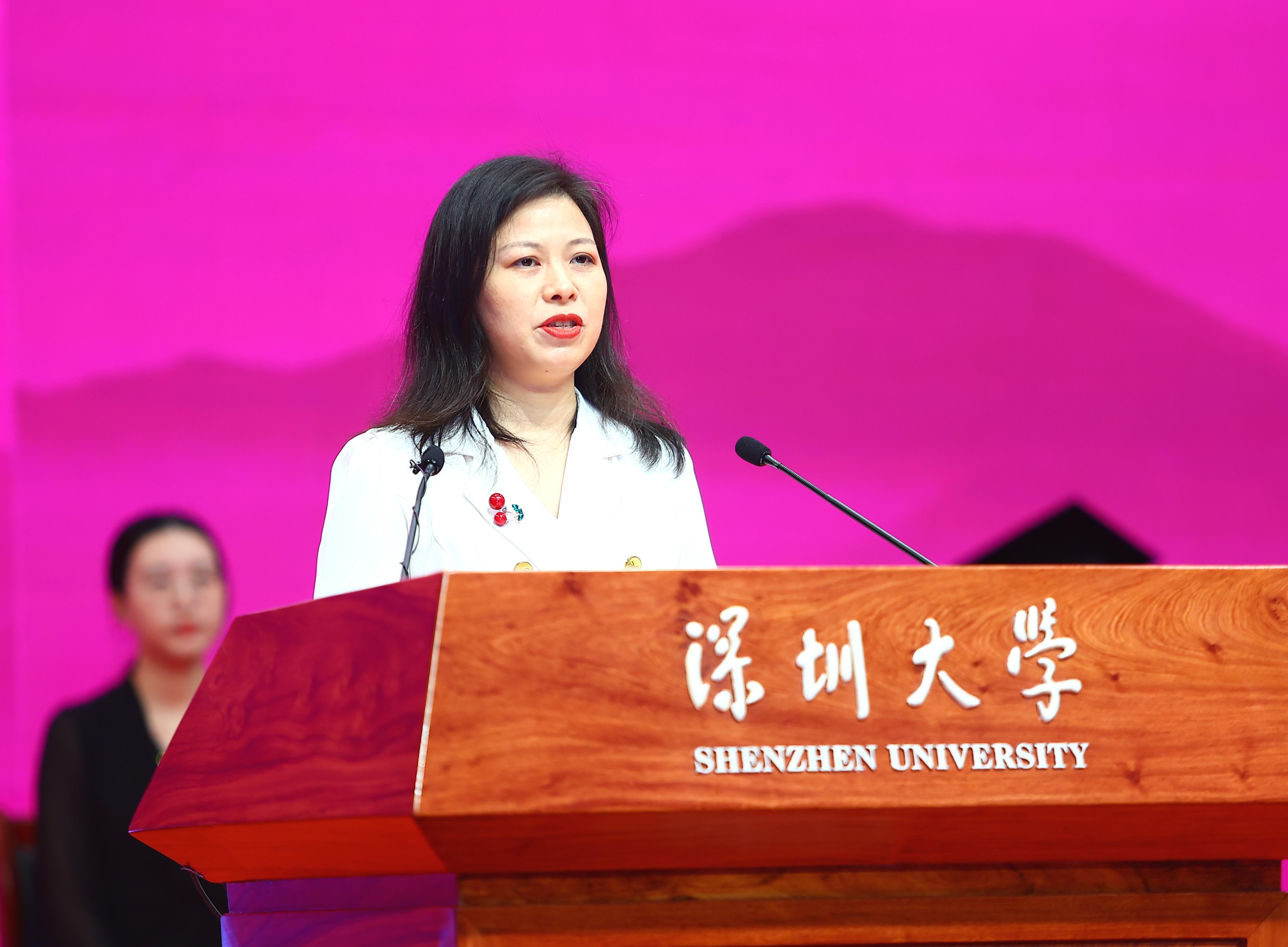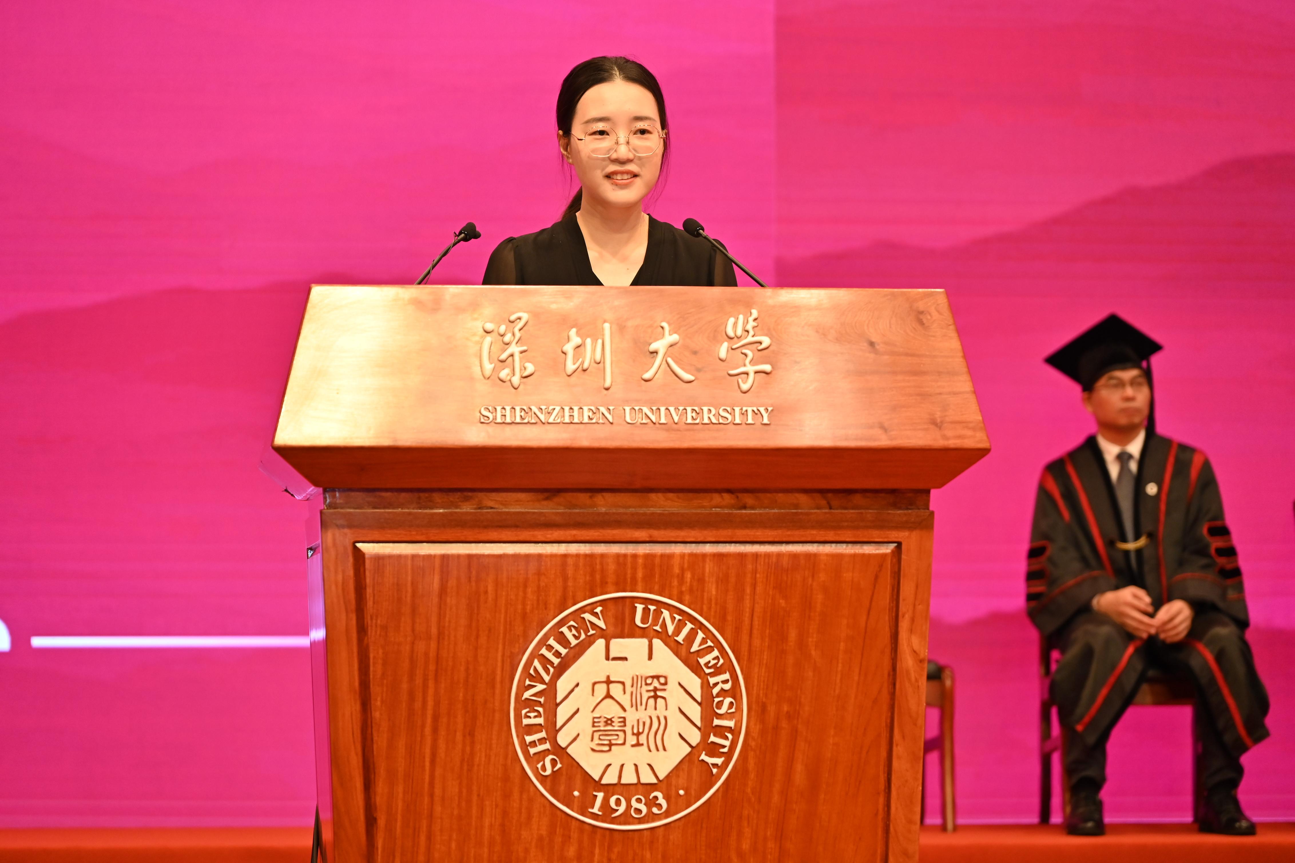 計算機(jī)與軟件學(xué)院2021級卓越班陳天行的母親江嬌麗在典禮上作為家長代表發(fā)言。她說,深大帶給孩子的遠(yuǎn)不止課堂上的知識,更有“把論文寫在祖國大地上”的實踐平臺、“陪學(xué)生熬夜改代碼”的良師益友、“與頂尖高校協(xié)同創(chuàng)新”的開放視野和“讓每個孩子找到自己光芒”的育人初心。她鼓勵畢業(yè)生們帶著深大賦予的“闖勁”與“溫度”,在廣闊天地中勇敢追夢、砥礪前行,用奮斗書寫理想,用擔(dān)當(dāng)定義青春,讓“深大人”的名字在時代的浪潮中熠熠生輝!