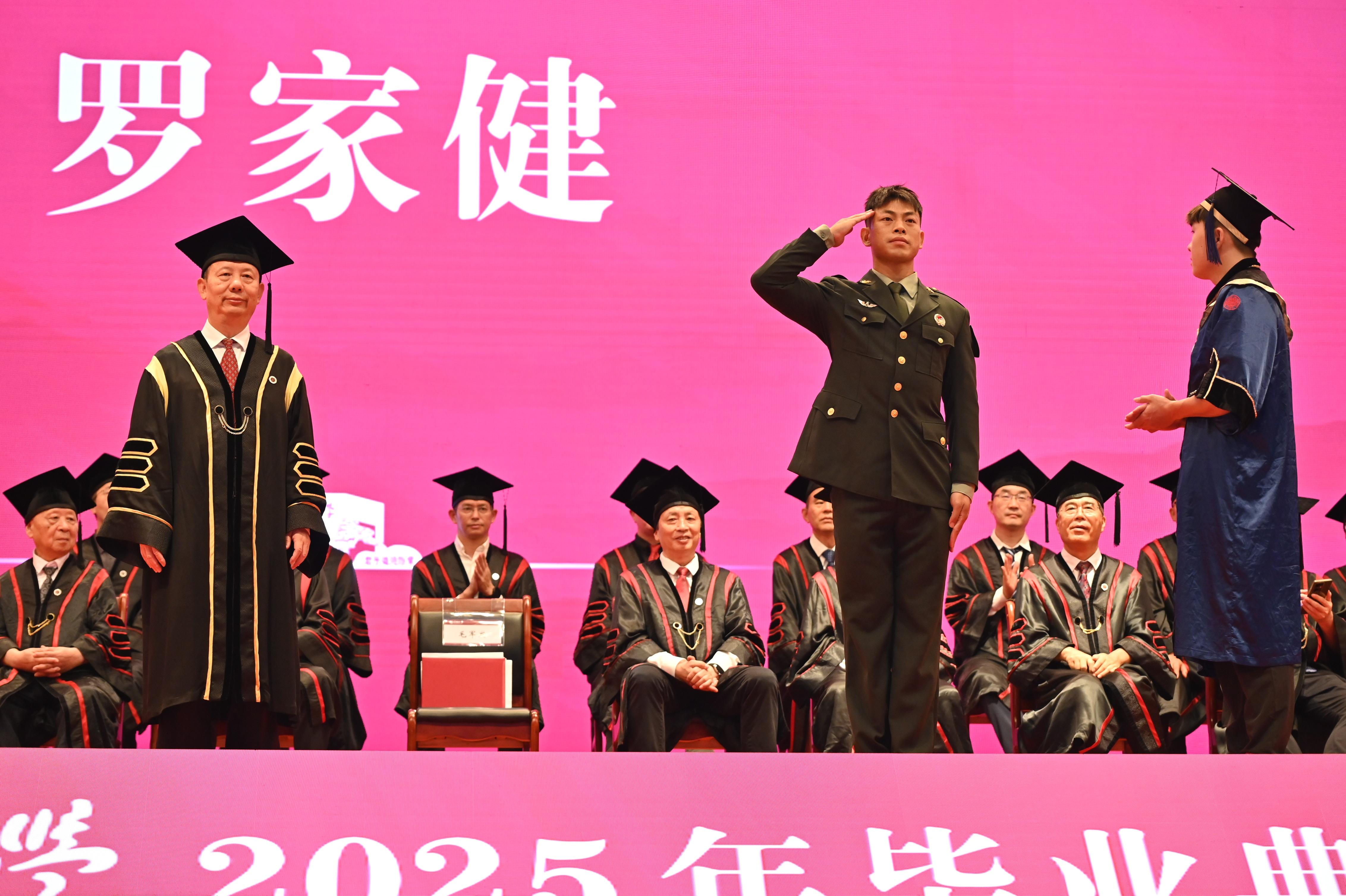 在激動人心的頒授學(xué)位證書環(huán)節(jié),體育學(xué)院本科畢業(yè)生羅家健上演“變身”,他在從校長手中接過學(xué)位證書后,又脫去學(xué)位服,著軍裝敬禮,向母校表達(dá)感激之情。據(jù)悉,羅家健2019年入伍,2021年退役后回到荔園。他曾服役于陸軍第74集團(tuán)軍某旅“硬骨頭六連”,服役期間該連被中宣部授予“時代楷?!狈Q號,羅家健個人也獲評海訓(xùn)優(yōu)秀個人以及嘉獎一次,退役返校后,在校園里又屢獲殊榮。畢業(yè)后,他將在深圳一學(xué)校擔(dān)任體育老師。“我要將退役軍人的優(yōu)良作風(fēng)與鋼鐵意志,以及深大‘自立自律自強(qiáng)’的校訓(xùn)精神融入到體育教學(xué)中,傳承給學(xué)生。”