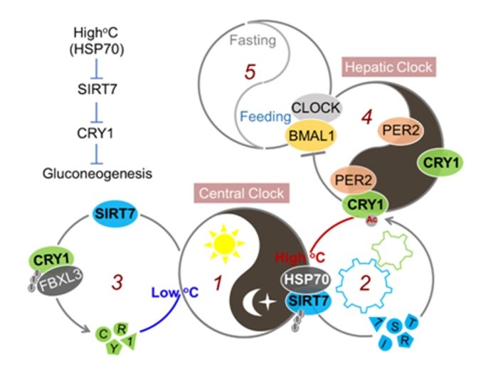 該研究發(fā)現(xiàn)肝臟中的SIRT7蛋白水平的節(jié)律受到光信號的調(diào)控,并且不依賴于進食行為。光信號通過SCN驅(qū)動了體溫(Body temperature,BT)的晝夜節(jié)律,進一步影響了熱激蛋白HSP70與SIRT7的相互作用,HSP70在體溫升高的時候介導了SIRT7蛋白的降解。這表明SIRT7是肝臟中較為早期的接收到SCN信號的蛋白。進一步的研究發(fā)現(xiàn)SIRT7可以直接對節(jié)律鐘的核心蛋白Cryptochrome 1(CRY1)的K565和K579進行去乙?;⑶掖龠ME3 ligase FBXL3復合物所介導的CRY1的泛素蛋白酶體降解。Sirt7突變小鼠肝臟節(jié)律基因的振幅有明顯的降低,而且相位發(fā)生明顯的位移。更重要的是,Sirt7突變小鼠肝臟節(jié)律基因能夠更快地適應(yīng)進食所介導的肝臟節(jié)律基因的相位移動,這表明肝臟的SIRT7整合了SCN調(diào)控的體溫信號和肝臟的節(jié)律鐘。最后對Sirt7突變小鼠的肝臟糖代謝的研究發(fā)現(xiàn),SIRT7特異性地調(diào)控了光周期條件下的肝臟糖異生,而Sirt7突變導致光周期條件下血糖的明顯降低。該研究揭示了一條新的信號途徑BT/HSP70-SIRT7-CRY1介導了中央節(jié)律和外周節(jié)律的同步化過程。
