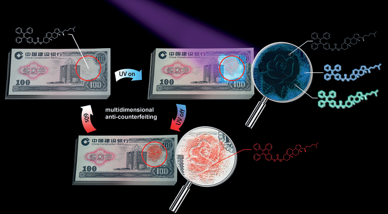 刺激熒光響應分子是一類重要的可用于光學傳感器制備的功能材料。目前已經報道的刺激熒光響應分子普遍具有單一響應的特點,難以滿足多元化的應用需求;多數刺熒光激響應小分子只具有雙色變化,在實現快速、可逆、高反差多色變化方面差強人意, 而且多數分子需要復雜冗長的合成,距離實際應用具有相當大的距離。李冰石教授課題組在手性分子研究中偶然發現具有膽固醇取代的四苯乙烯分子具有多色力至變色特性,進而系統研究了此類分子的三重熒光色和兩重基態色的變色過程,通過控制外部刺激實現多態間的可逆轉化。該分子具有合成簡單,多刺激變色,響應快、高反差等諸多優點,是理想的防偽材料。利用這些特點,課題組將所制備的分子用于紙幣的防偽,實現了多重防偽的設計理念,結果如所示。