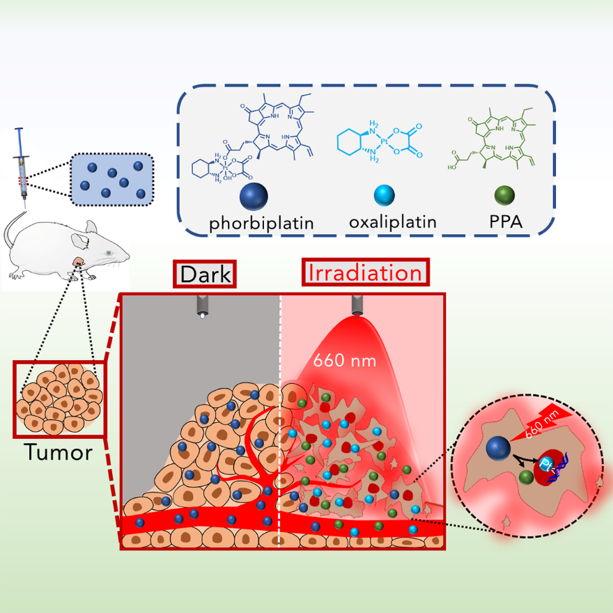 化療依然是臨床上治療癌癥的重要手段之一。大部分化療藥物由于缺少對腫瘤組織的選擇性,殺死腫瘤細胞的同時也對正常組織產生毒副作用。因此,實現化療藥物在腫瘤組織中選擇性激活從而降低化療的毒副作用具有重要的臨床價值。一種極具有潛力的解決化療藥物毒副作用的藥物設計思路是制備光可控激活的前藥。這類藥物給藥后在黑暗環境中穩定,毒性低;針對腫瘤位置進行光照時,腫瘤內的前藥迅速活化成活性藥,繼而殺死腫瘤細胞。此研究中,將對紅光響應的卟啉類氧化還原催化劑脫鎂葉綠素(pyropheophorbide-a, PPA)引入到惰性的基于奧沙利鉑的四價鉑前藥中得到了首例高效紅光可控激活小分子四價鉑前藥(phorbiplatin)。該前藥在生理條件下穩定,化學惰性高,毒性極低。在低強度的紅光(650 nm, 7 mW/cm2)照射下,前藥迅速還原成活性藥奧沙利鉑并釋放PPA,發揮抗腫瘤活性。進一步對前藥的光活化機理進行了深入的研究表明,激發態的PPA從還原劑中得到電子生成還原態的PPA,繼而將電子傳遞給四價鉑中心,啟動前藥的還原過程,這揭示了其獨特的光活化機制。最后,團隊人員將前藥注射到小鼠腫瘤模型中,給藥后對小鼠腫瘤進行紅光照射。結果表明,與奧沙利鉑及奧沙利鉑與PPA的混合物相比,該前藥具有更強的體內抗腫瘤活性,并且比奧沙利鉑和PPA的混合物具有更低的毒性。這項研究首次報道了可以運用到活體內的紅光可控激活的鉑類前藥,為設計光可控激活的四價鉑前藥提供了一種新的策略,對開發新型可控低毒性的化療藥物具有重要意義。