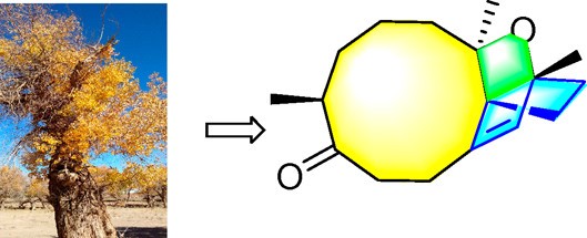 胡楊又被稱為大漠中的英雄樹,“生而千年不死、死而千年不倒、倒而千年不朽”是對胡楊的美譽。胡桐淚系胡楊在鹽堿的非生物脅迫下分泌的樹脂,自古被納入中藥使用。程永現與焦亞斌教授聯合培養的碩士研究生劉凱新從中分離鑒定了一個形狀上類似“蝸牛”的結構新穎的西松烷型二萜,借助仿生學啟發,繼而發現該分子可顯著促進間充質干細胞的增殖與分化,提示其對創面修復的潛力(Org. Lett. 2019DOI: 10.1021/acs.orglett.9b00423; 我校朱艷霞博士為論文的共同第一作者)。