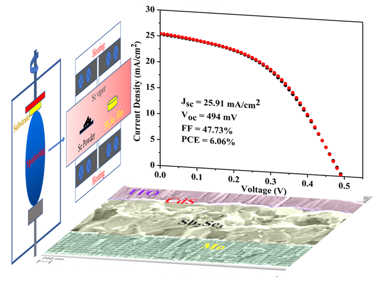 近年來,新型環境友好型Sb2Se3材料由于物相單一,光學帶隙可調以及較高的光吸收系數,介電常數和載流子遷移率等優點,在硫系銻基薄膜太陽電池領域得到廣泛關注和研究。目前,太陽電池中最關鍵的光吸收層Sb2Se3薄膜制備主要采用熱蒸發(包括CSS、VTD和RTE)結合原位襯底溫度控制析晶的工藝來實現。而關于濺射法制備Sb2Se3薄膜的報道較少,本文提出采用與CIGS基太陽電池生產工藝兼容性較高的磁控濺射技術并結合后硒化法制備Sb2Se3薄膜材料同樣非常有優勢,此方法利用高能離子濺射獲得高質量Sb2Se3非晶薄膜并結合可控性更高的后硒化有效析晶技術,制備出高結晶度且定向生長的Sb2Se3薄膜,不會出現原位熱處理成分易偏析問題,有效減少硒空位(深能級缺陷)的產生,降低器件中的復合損耗,首次獲得基于濺射后硒化法制備出最高光電轉換效率為6.06%的Sb2Se3薄膜太陽電池,同時開路電壓增加到494 mV(目前純Sb2Se3薄膜太陽電池最高開路電壓值)。此外,將無封裝的全無機Sb2Se3薄膜太陽電池存放于空氣中,1000小時內仍能保證90%的初始光電轉換效率,顯示了良好的穩定性