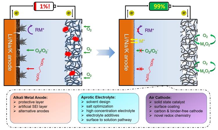 近十年來,新能源電動汽車得到了蓬勃發展,但當前的鋰離子電池技術難以滿足電動汽車長續航里程的需求。因此,人們迫切期待高能量密度和高輸出功率的新電池技術。由鋰、鈉、鉀等堿金屬與氧氣組成的空氣電池因能量密度高、成本低等優勢,贏得了業界廣泛關注,但此類電池也存在空氣電極副反應嚴重、電解液不穩定、堿金屬負極易產生枝晶和體積膨脹、電池生命周期短等缺點,使得二次堿金屬空氣電池的前景不容樂觀。如何提高正極材料在高電位和富氧自由基條件下的穩定性,如何提高電解液對氧自由基的耐受性以及與堿金屬負極的匹配性,如何抑制堿金屬負極的枝晶生長和體積膨脹,提高負極的穩定性,這些都是目前堿金屬空氣電池研究中的難點和熱點。