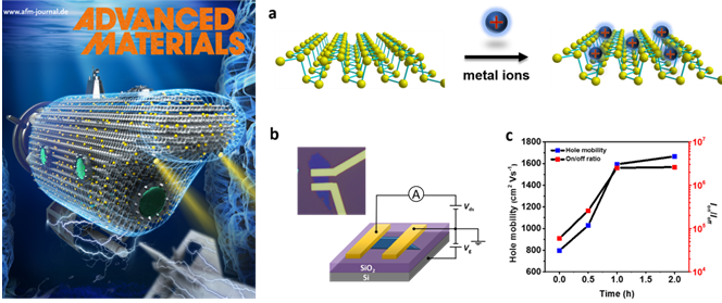 論文封面設(shè)計(jì)圖;金屬離子修飾黑磷的過(guò)程示意圖;基于金屬離子修身的黑磷的場(chǎng)效應(yīng)管器件結(jié)構(gòu)和測(cè)試結(jié)果