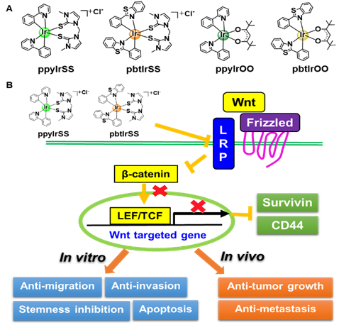 圖1.A.金屬銥配合物B.含硫金屬銥配合物能夠通過靶向作用于Wnt/β-catenin信號通路的Wnt共受體LRP6對乳腺癌的發生發展及乳腺癌干性產生抑制作用
