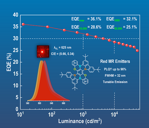 針對上述問題,深圳大學楊楚羅教授課題組提出了一種簡單有效的“雙硼氮氧”多重共振分子設計策略,構筑了一類窄譜帶紅光發光材料,這一類發光材料不僅能方便的合成和衍生,還具有優良的光物理性能,包括高的光致發光量子產率(97%)、極快的輻射躍遷速率(7.4 ⅹ 107s-1),以及窄的半峰寬(32 nm)。基于這類發光材料制備的純紅光OLED器件外量子器件效率高達36.1%,是目前報道的紅光OLED器件效率最高值,性能顯著優于傳統的磷光和給受體型熱活化延遲熒光材料OLED。與此同時,此OLED器件還具有極低的效率滾降(亮度50000 流明時外量子效率仍高達25.1%),超高的亮度(高達135000流明),以及優良的器件穩定性。這一工作對開發高效紅光發光材料以實現高性能全色OLED顯示具有重要的意義。