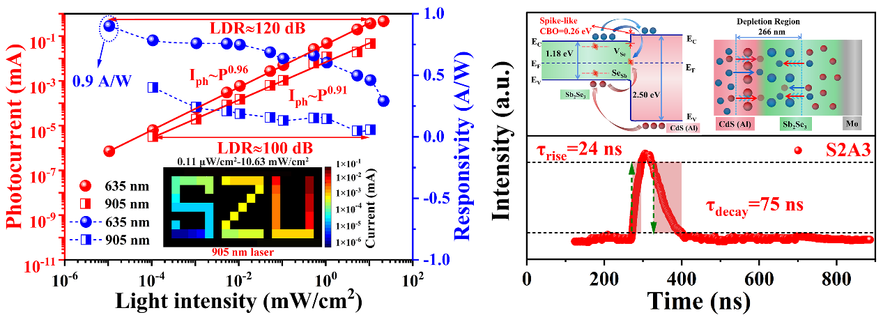 Sb2Se3在新型高效低成本薄膜光電探測器研究領域引起廣泛關注,主要由于以下優勢:(1)一維晶體結構,探測器像素之間無橫向串擾:Sb2Se3具有一維晶體結構(c方向為共價鍵,a和b方向為弱范德華力相互作用),強各向異性促使載流子沿著[Sb4Sb6]n鏈有效地運輸,在鏈間則以hopping形式傳輸,利于消除探測器橫向串擾;(2)缺陷存在互補償:Sb2Se3天然存在VSb、VSe等點缺陷,對應的缺陷深度為0.4~0.7 eV,有望利用缺陷吸光進行非本征探測將探測波段拓寬至2000 nm;(3)Sb2Se3具有較低的結晶溫度(133°C),相應探測器與CMOS工藝高度兼容。本文采用濺射硒化法制備了[hk1]擇優取向生長的Sb2Se3薄膜,構建優異的Sb2Se3/CdS平面異質結光電探測器。為了進一步提升器件性能,利用Al3+摻雜CdS緩沖層,降低界面缺陷密度和體缺陷密度、增加耗盡層寬度以及優化p-n結界面能帶排列,進一步降低器件的載流子復合,提升載流子輸運能力。基于此,該薄膜光電探測器能夠實現無外加偏壓自驅動工作,響應度提升至0.9 A/W、探測度達到4.78×1012Jones、開關比高達106、線性動態范圍高達120 dB、響應速度首次達到ns量級(響應時間24 ns和恢復時間75 ns)。相關研究成果發表在InfoMat (2023) e12400上(影響因子:24.798),陳爍為論文第一作者,其指導的碩士研究生付毅為第二作者,梁廣興為通訊作者,深圳大學為唯一通訊單位。