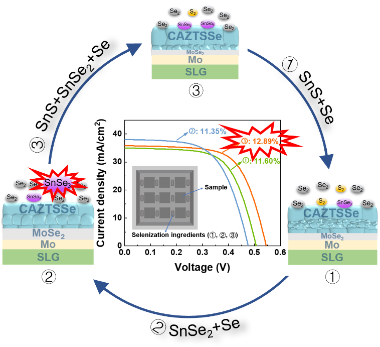 鋅黃錫礦半導體Cu2ZnSn(SxSe1-x)4(CZTSSe)因其廉價無毒的元素組成以及具有大于32%的理論光電轉換效率成為很有前途的薄膜光伏材料之一。近年來CZTSSe薄膜太陽電池的效率不斷攀升,但仍遠低于其理論值,這主要歸因于較大的開路電壓虧損。本文采用非真空綠色環保的溶膠凝膠法結合硒化熱處理生長CZTSSe薄膜,深入剖析硒化反應機理,首次闡明了抑制錫損失的蒸氣成分(氣態SnSe3)以及SnSe3促進CZTSSe形成路徑;并在SnS和SnSe2粉末以及Se粒結合的硒化條件下獲得了高結晶度且成分可控的光吸收層CZTSSe薄膜,其后構建CZTSSe薄膜太陽電池進行物理分析,研究表明,高結晶質量的吸收層薄膜使得晶界處的能帶彎曲程度最優以及有效抑制了界面復合。此外,CuZn和CuSn反位缺陷濃度顯著降低,開路電壓從508 mV提高到546 mV,最終獲得在空氣環境中制備CZTSSe薄膜太陽電池的最高光電轉換效率12.89%。相關研究成果發表在Advanced Energy Materials (2023)2300521(影響因子:29.698),梁廣興和蘇正華為通訊作者,其指導的碩士研究生于紫軒為第一作者,深圳大學為唯一通訊單位。