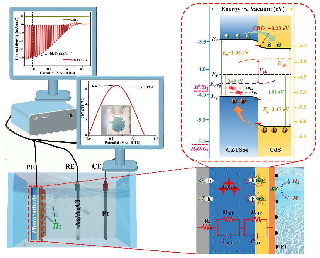 基于CZTSSe薄膜優異的光電性能,構建出Glass/Mo/CZTSSe/CdS/TiO2/Pt薄膜光電陰極實現太陽光水解制備“綠氫”;通過協同光吸收層薄膜和異質結界面性能優化,顯著地抑制界面非輻射復合損失,從而提升電荷的分離和轉移效率,將CZTSSe薄膜光電陰極的光電流密度提升至目前已報道的最高值40.40 mA cm?2,接近其理論光電流密度值42.85 mAcm?2;同時,獲得6.47%的半電池太陽能-氫能轉化效率。相關研究成果發表在Advanced Energy Materials (2023) 2300215上(影響因子:29.698),梁廣興為論文第一作者,其指導的碩士研究生李志東為第二作者,陳爍為通訊作者,深圳大學為唯一通訊單位。