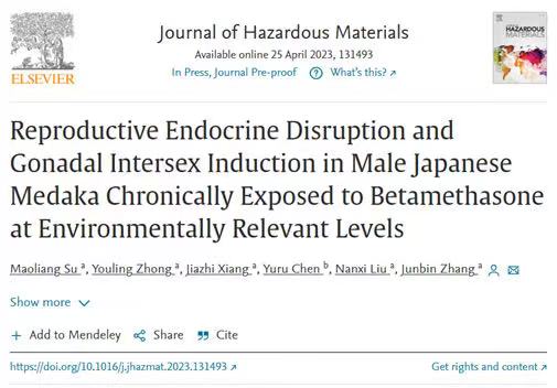 近日,國際環境領域頂級學術刊物Journal of Hazardous Materials(中科院大類一區Top,IF=14.224)在線發表了來自深圳大學生命與海洋科學學院蘇冒亮特聘副研究員以及張俊彬特聘教授團隊題為Reproductive Endocrine Disruption and Gonadal Intersex Induction in Male Japanese Medaka Chronically Exposed to Betamethasone at Environmentally Relevant Levels的研究論文,揭示了環境殘留的倍他米松對水生生物存在生殖毒性,并闡明了其生態毒性形成的效應機制。