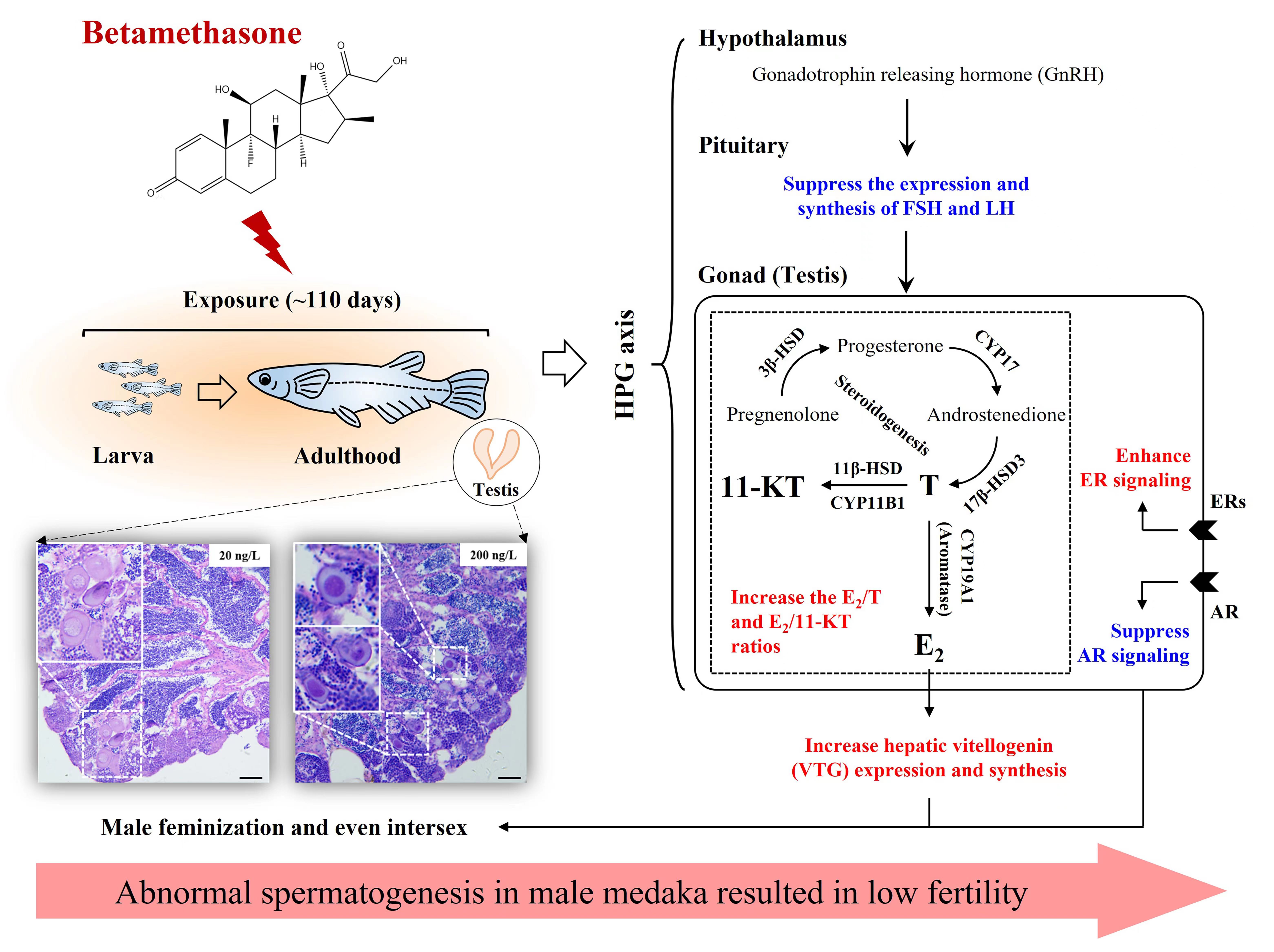 該研究以日本青鳉(Oryzias latipes)為對象,證明環境中殘留的倍他米松可以干擾日本青鳉的中樞神經系統促性腺激素的合成與分泌,調節下丘腦-垂體-性腺(hypothalamus-pituitary-gonad,HPG)軸,影響性激素的合成與分泌,導致雄性個體體內雌激素比例上調,誘導雄魚雌性化,甚至間性現象的產生,最終降低雄性個體繁殖力,此外,該研究從分子機理上闡明了倍他米松造成雄性個體生殖能力損傷的毒性效應機制。本研究的開展,首次證明了低至20 ng/L的倍他米松即可形成生殖毒性,將倍他米松的毒性效應閾值濃度降低了50倍。研究結果為進一步評估倍他米松污染導致的環境生態風險及其治理提供了數據與理論支撐。