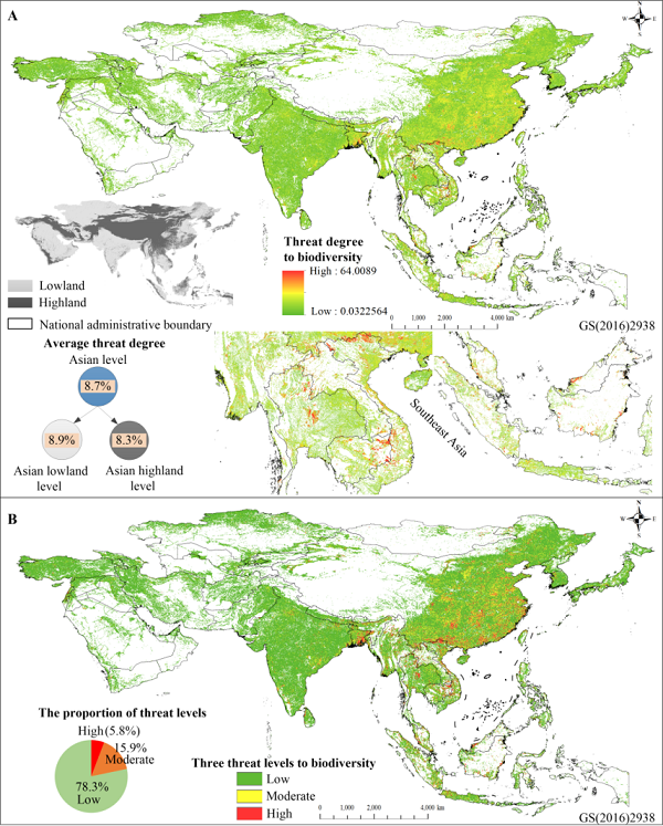 2000-2020年期間亞洲人類活動擴張對生物多樣性的威脅程度分布: A 威脅程度圖(1×1 km2分辨率)和平均威脅度, B威脅水平(即高、中、低)