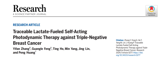 近日,深圳大學醫學部生物醫學工程學院黃鵬特聘教授團隊張一帆助理教授在Science合作期刊《Research》(影響因子11.0,中科院一區,TOP期刊)上發表了題為《Traceable Lactate-Fueled Self-Acting Photodynamic Therapy Against Triple-Negative Breast Cancer》的研究論文。該團隊張一帆助理教授和馮光樂碩士生為論文共同第一作者,黃鵬教授為通訊作者,深圳大學為唯一單位和唯一通訊單位,該團隊所在的生物醫學工程學科屬于廣東省優勢重點學科。