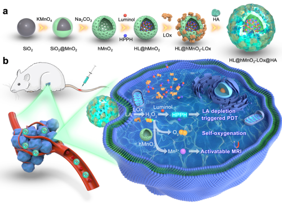 三陰性乳腺癌(TNBC)是乳腺癌中預后最差的一種亞型,主要原因是除全身化療外缺乏其他有效的治療方法,而且具有侵襲性。光動力療法(PDT)通過時空控制的光照實現癌癥靶向治療,產生足夠的單線態氧消滅腫瘤細胞。然而,TNBC腫瘤的缺氧狀態嚴重阻礙了PDT的氧氣供應。此外,光在TNBC腫瘤中的穿透深度有限。為了解決上述問題,該團隊通過在中空二氧化錳納米粒子中共同負載光克洛(HPPH或Photochlor?)、發光酚和LOx,制備了一種可追蹤的以LA為燃料的自運行PDT納米體系。為了增強腫瘤靶向能力并保護LOx不被水解,制備的納米粒子用透明質酸(HA)裝飾(HLMLH)。剛開始,LOx消耗瘤內LA并產生雙氧水。隨后,生成的雙氧水氧化發光酚產生氨酞酸根離子,并發出藍色熒光,在約440 nm處達到峰值。然后,化學發光通過發光酚和HPPH之間的化學能量共振轉移(CRET)激活HPPH,從而實現熒光成像引導的PDT。同時,中空二氧化錳載體在酸性腫瘤微環境中被雙氧水降解并產生氧氣,從而改善TNBC腫瘤的缺氧狀況,成為PDT的來源。這一過程伴隨著錳離子的生成,錳離子不僅可作為活化MRI的T1造影劑,還能催化雙氧水分解產生羥基自由基并增強化學發光。因此,HLMLH納米系統有望對TNBC進行可追蹤的自發光/自供氧PDT。