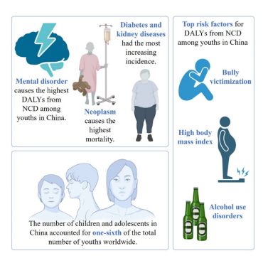 近年,我國兒童和青少年的傳染病死亡率下降了68.7%,與此同時我國經歷了快速的社會轉型、城市化和全球化,導致青少年中廣泛存在的慢性病風險因素,例如缺乏運動、久坐等不良生活方式和智能手機成癮等。預計我國有15.6%的學齡前兒童和31.8%的學齡兒童超重或肥胖,在2030年或將導致610億美元的醫療費用。本研究通過大數據分析及模型構建首次揭示了在1990-2019年期間我國兒童及青少年人群中慢性疾病負擔變化趨勢。研究發現(1)心理行為異常在我國兒童(10-14歲)、青少年(15-19歲)、青年(20-24歲)人群中均造成了最高的傷殘調整壽命年(DALYs);(2)非傳染性疾病中造成兒童及青少年人群死亡率最高的是腫瘤,特別是白血病;(3)欺凌行為是兒童及青少年人群心理行為異常DALYs的主要危險因素;(4)高BMI指數、酒精濫用等是腫瘤DALYs的主要危險因素。對于慢性病的控制,需要早期干預,特別是針對其在年輕人群中的早期發病。本研究不僅總結了我國兒童和青少年慢性疾病負擔及變化趨勢,更為制定有效干預政策提供了科學參考。