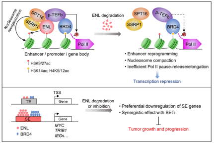 該研究首先通過腫瘤細胞的BETi敏感度與基因依賴程度的相關性篩選,得到含YEATS結構域的組蛋白乙酰化閱讀器ENL這一可能影響BETi敏感性的表觀遺傳因子。研究人員發現在不同來源的腫瘤細胞中絕大多數SE都被ENL占據,其結合的偏好程度遠高于普通增強子,而且ENL在SE上的富集依賴于它結合乙酰化組蛋白的能力。利用植物生長素誘導降解標簽標記內源ENL基因,研究人員發現在腫瘤細胞中誘導ENL蛋白的急性降解可強烈抑制SE控制基因的轉錄,如經典癌基因MYC,而恢復ENL蛋白表達可很大程度上逆轉這些效應。機制上,ENL與組蛋白伴侶FACT (FAcilitates Chromatin Transcription)復合物相互作用,是FACT招募到包括SE在內的順式調節元件的必要條件,而FACT則可能介導轉錄啟動和延伸所需的核小體重構。更重要的是,ENL-FACT復合物對轉錄的控制受BRD4的調節。在結直腸癌中,ENL的過度表達與腫瘤的生長、轉移及較差預后密切相關,靶向降解或抑制ENL能與BETi協同抑制結直腸癌的生長。