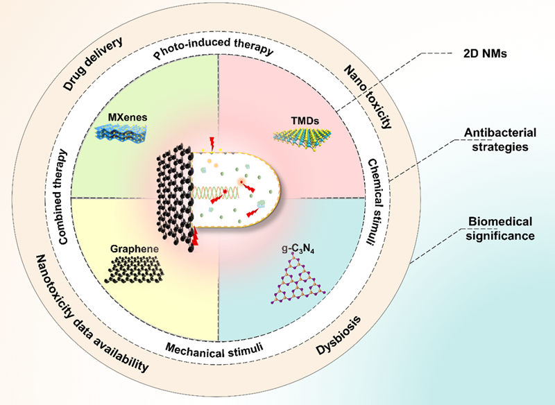 圖1:概述基于抗菌機制不同的二維納米材料的生物醫學意義、微生態失調和細胞納米毒性等