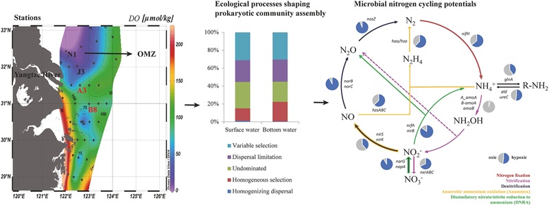 由于全球變暖和環境污染,海洋中的低氧區(OMZs)逐年擴大,嚴重影響整體的微生物群落結構和全球氮循環。作為世界上最大的沖積河口之一,長江口自20世紀80年代以來已經表現出季節性的低氧區,但其中的微生物群落組成及其對氮循環影響尚不清楚。李猛教授研究團隊基于16S rRNA基因和宏基因組測序分析,揭示了長江口水體微生物多樣性、群落組裝機制和氮代謝潛力。研究發現,長江口不同水層的微生物群落組成具有特定的變化,以變形菌門(Proteobacteria)、擬桿菌門(Bacteroidetes)和藍細菌(Cyanobacteria)為主,且隨機性過程和確定性過程共同塑造了長江口水體微生物群落。研究還發現,pH值是影響表層水體中微生物組成的最重要環境因素,其次是硅酸鹽、磷酸鹽和離岸距離;而水深、銨氮和磷酸鹽則是影響底層水體的微生物組成的主要因素。物種和功能基因分析還揭示了參與氮循環的潛在菌屬,發現它們在底層水中具有更高的豐度,特別是執行反硝化和厭氧氨氧化的微生物類群。