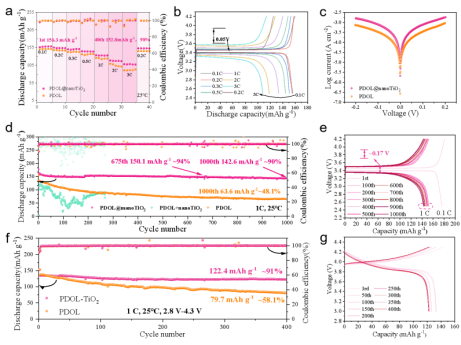 圖2. 鋰金屬電池循環(huán)性能測試NHCPE(PDOL@nanoTiO2)a、b)LFP|PDOL@nanoTiO2|Li的倍率性能和相應(yīng)的充放電曲線。c) 使用PDOL@nanoTiO2和PDOL的Tafel圖。d) LFP|PDOL@nanoTiO2|Li, LFP|PDOL|Li電池在1C下的長周期性能。e) LFP|PDOL@nanoTiO2|Li電池充放電曲線。f)LiCoO2|PDOL@nanoTiO2|Li, LiCoO2|PDOL|Li電池在1C下的循環(huán)性能。g)LiCoO2|PDOL@nanoTiO2|Li電池的充放電曲線。