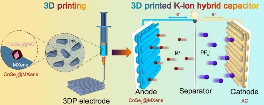 (2)該團隊在期刊Chemical Engineering Journal(影響因子:15.1,中科院大類一區)上發表題為“Customizing CoSe2/Ti3C2Tn MXene hybrid inks toward high-energy-density 3D-printed K-ion hybrid capacitors”的研究論文。該研究基于3D打印技術結合CoSe2@Ti3C2Tn MXene負極材料構筑鉀離子混合電容器,具有高能量密度和長壽命。質量能量密度高達199 Wh kg-1,循環6000圈后容量保持率為84.8%。這項工作將為開發穩定、安全、可靠的鉀離子混合電容器開辟一條新的路徑,并且可以推廣到其他金屬離子混合電容器。碩士生劉文峰為論文的第一作者,李亞運副教授為獨立通訊作者,深圳大學材料學院為第一完成單位。