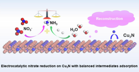 (4)該團隊在期刊Journal of Colloid and Interface Science(影響因子:9.4,中科院大類一區)上發表題為“Enhanced electrochemical nitrate reduction on copper nitride with moderate intermediates adsorption”的研究論文。該研究基于氮化銅進行電催化硝酸鹽還原,結合理論計算闡明了調控反應中間體的吸附能在促進催化過程提升中所發揮的關鍵作用,利用原位與非原位技術相結合手段,驗證了催化劑在實際電位環境下的重構現象。魏金山副研究員為論文的第一作者,李亞運副教授為獨立通訊作者,深圳大學材料學院為第一完成單位。