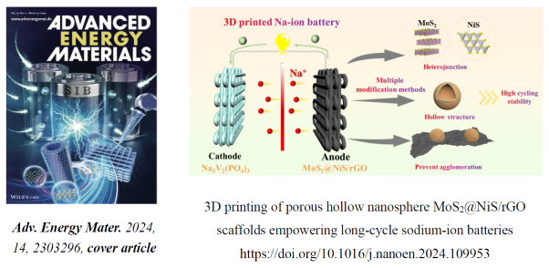 鈉離子電池作為最有吸引力的大規模儲能設備之一,需要對容量和長循環性能進行優化。該研究結合高精度電極制備工藝3D打印技術,MoS2@NiS/rGO作為負極材料,通過電極結構設計和界面工程調控,材料倍率性能和循環穩定性得到了顯著提高。這項工作是該研究團隊繼2024年初,在《Advanced Energy Materials》期刊發表封面論文后(下圖左,3D printed sodium-ion batteries via ternary anode design affording hybrid ion storage mechanism, Adv. Energy Mater. 2024, 14, 2303296, cover article,https://doi.org/10.1002/aenm.202303296),關于3D打印制備鈉離子電池的又一研究成果,為鈉離子電池器件的設計和制備提供新的思路。