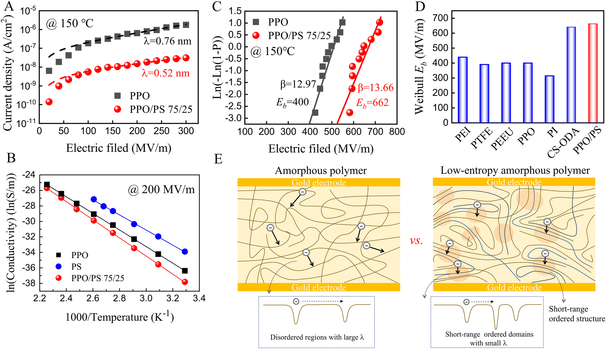 該研究是在前期工作基礎上(Matter,2021,4(7):2448-2459)進行的深入拓展,旨在解決薄膜電容器在高溫下漏電流急劇提升的核心科學問題。研究提出了一種低熵非晶態(tài)聚合物構筑策略。該低熵非晶態(tài)聚合物由高玻璃化轉變溫度的聚(2,6-二甲基-1,4-苯撐氧化物)(PPO)和聚苯乙烯(PS)分子級共混而成,在高溫和高電場下表現(xiàn)出優(yōu)異的電容性能。材料設計原理是利用PS的苯環(huán)與PPO的苯環(huán)之間的強范德華力,在分子水平上“拉伸”主鏈,從而顯著降低非晶態(tài)聚合物的分子構象熵,形成隨機取向但高度緊密堆積的延展聚合物鏈,通過深能級局部態(tài)抑制電荷傳輸。研究結果表明,該低熵非晶態(tài)介電聚合物在150℃下表現(xiàn)出5.5?J/cm3的放電能量密度和超過90%的充放電效率,性能優(yōu)于現(xiàn)有的介電聚合物,并顯示出放電能量密度的兩倍以上的提升。此外,與其他方法相比,該薄膜加工工藝(即聚合物共混)更簡單、直接且成本低,因此該方法為高性能和高質量聚合物薄膜的量產鋪平了道路,這些薄膜在高溫薄膜電容器中具有廣泛應用。