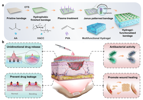 1. 高效單向藥物輸送和傷口護理的水凝膠功能化繃帶