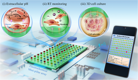 報道了一個集成的微型柱平臺,用于原位監測多個細胞代謝過程,通過陣列式微型柱芯片實現培養基錨定和細胞培養。該平臺集成了表面功能化微電極生物傳感器,以構建一個集成的微型柱生物傳感平臺,能夠實時、原位監測各種細胞的細胞生長過程。陣列式微型柱芯片可實現培養基和細胞陣列培養的親水錨定。用聚苯胺(PANI)和樹枝狀金功能化的微電極生物傳感器表現出優異的線性度(R2= 0.999)和高pH靈敏度(63.55 mV/pH),pH范圍為6.0至8.0。卓越的生物傳感性能使其具有廣泛的適用性,有助于通過微型柱生物傳感平臺實時監測藥物刺激誘導細胞培養基的pH值變化。長期原位監測還有助于3D細胞球體的輔助培養。這種簡單、pH敏感且生物相容的細胞培養生物傳感平臺提供了一種監測細胞代謝的新方法,有望成為原位細胞培養的強大工具。該論文發表在中科院與Science集團合作的一區期刊Research上,深圳大學為唯一完成單位。