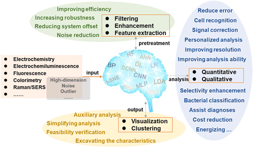 這篇綜述深入探討了將AI算法(包括分類、回歸和聚類技術)集成到各種生化傳感器中的最新進展。討論涵蓋了AI技術的代表性類型和功能,特別強調了它們在電化學、電化學發光、熒光、比色法和拉曼光譜學中的應用。為了激勵其他研究人員使用AI技術合理有效地解決問題,我們精心概述了AI在各種上下文中的具體實現,包括輔助診斷、精確分析、性能增強和系統優化。通過詳細探索人工智能如何在這些生化傳感領域中發揮作用,闡明了應用的廣度以及對傳感技術的準確性和效率的潛在影響。最終,我們闡明了與生化傳感器和AI融合相關的挑戰和機遇。它不僅突出了商業化的光明前景,還解決了成功整合這些技術需要克服的障礙。該論文發表在中科院一區期刊Trac-Trends in Analytical Chemistry上,深圳大學為唯一完成單位。