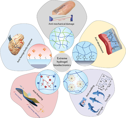 圖9.極端水凝膠生物電子學,包括抗機械損傷,抗腫脹,防凍等水凝膠生物電子學
