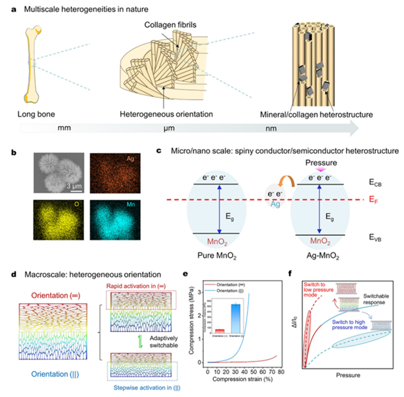 提出了一種基于多尺度異質性(微/納米級異質結構和宏觀異質細胞骨架)的壓阻接口,可以動態適應特定的壓力傳感要求。多刺Ag-MnO2壓阻微粒中的微納米級異質結構能夠實現較低的檢測限制(0.008 Pa),并在高預載下高分辨率(0.0083%)的感知較小的壓力增量。此外,具有異質取向的細胞骨架能夠實現各向異性變形,即在低壓下快速變形和在高壓下逐步釋放。與具有同質或單尺度異質接口的傳感器相比,這種異質方向的設計提供了可切換的靈敏度和工作范圍,能夠區分復雜的壓力源。該論文發表在自然指數期刊ACS Nano上,深圳大學為第一完成單位。