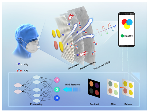 圖4.可穿戴比色面罩用于呼吸氨檢測示意圖