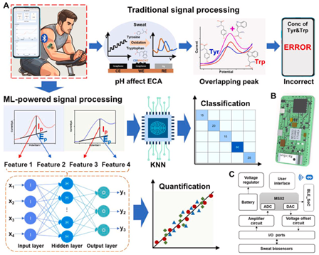 圖5.機器學習驅動的可穿戴傳感器用于區分汗液成分和預測疾病的示意圖