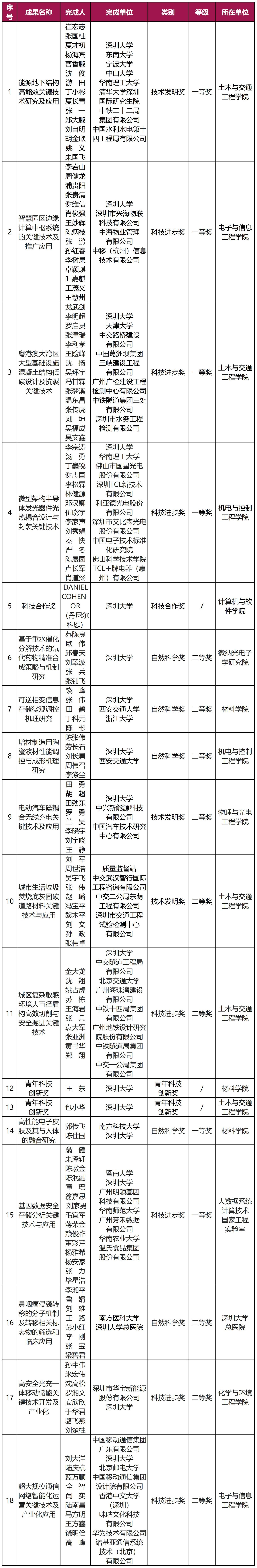 深圳大學2023年度以第一完成單位共申報廣東省科學技術獎61項,成功受理61項,最終以第一完成單位獲獎13項,獲獎數創歷史新高,獲獎率21.3%,高于全省平均水平。其中包括一等獎4項、二等獎6項、青年獎2項和科技合作獎1項。深圳大學的一等獎獲獎數量并列全省第二,并且首次獲得科技合作獎,實現了深圳大學在該獎項上的零突破。此外,深圳大學作為參與單位還獲得了一等獎2項和二等獎3項。