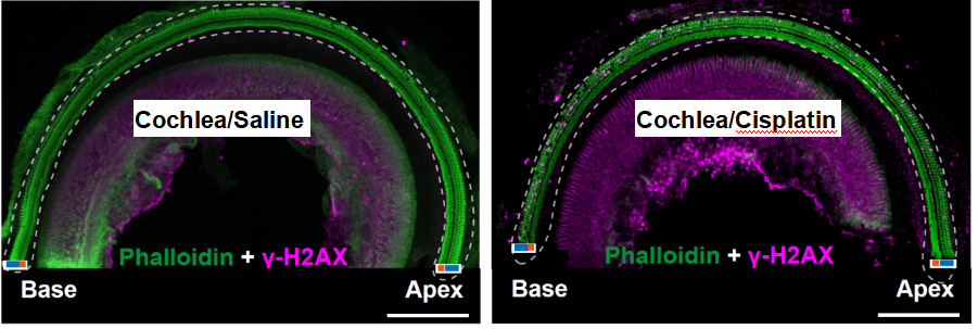 耳蝸毛細(xì)胞是聽神經(jīng)系統(tǒng)中將聲波轉(zhuǎn)換成神經(jīng)電信號(hào)的最關(guān)鍵細(xì)胞。毛細(xì)胞是終末分化細(xì)胞,一旦死亡,無法再生。毛細(xì)胞的損傷導(dǎo)致不可逆的聽力喪失。盡管DNA損傷修復(fù)機(jī)制在多個(gè)器官的細(xì)胞保護(hù)中扮演著重要角色,但耳蝸毛細(xì)胞中是否有DNA雙鏈斷裂損傷修復(fù)機(jī)制以及該機(jī)制如何保護(hù)毛細(xì)胞仍是一個(gè)未解之謎。本研究首次在小鼠體內(nèi)證明化療藥物順鉑及衰老在耳蝸外毛細(xì)胞中引起DNA雙鏈斷裂,進(jìn)而導(dǎo)致其凋亡與聽力下降。而BRCA1促進(jìn)修復(fù)外毛細(xì)胞DNA雙鏈斷裂,防止其凋亡和聽力喪失。