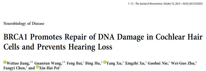 2024年10月,深圳大學(xué)醫(yī)學(xué)部基礎(chǔ)醫(yī)學(xué)院裴新海教授團(tuán)隊(duì)在聽神經(jīng)系統(tǒng)的DNA損傷修復(fù)機(jī)制的研究上取得進(jìn)展,成果報(bào)道在學(xué)術(shù)期刊Journal of Neuroscience上,標(biāo)題為“BRCA1 Promotes Repair of DNA Damage in Cochlear Hair Cells and Prevents Hearing Loss”,該工作揭示了耳蝸毛細(xì)胞中存在有DNA雙鏈斷裂損傷修復(fù)機(jī)制,同時(shí)DNA損傷修復(fù)蛋白BRCA1在促進(jìn)毛細(xì)胞DNA雙鏈斷裂損傷修復(fù),防止聽力喪失中起關(guān)鍵作用。醫(yī)學(xué)部副研究員蔣暐弢與碩士生王官潤為本研究的共同第一作者,裴新海教授為通訊作者,深圳大學(xué)為第一作者單位和通訊單位。