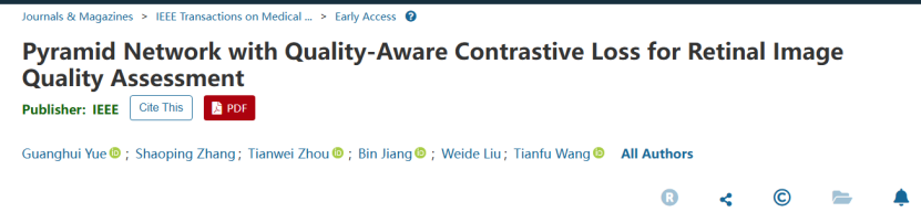 近日,深圳大學醫學部岳廣輝副教授在醫學圖像處理領域頂級期刊IEEE Transactions on Medical Imaging (TOP期刊,中科院一區,IF=8.9)上發表題為“Pyramid Network with Quality-Aware Contrastive Loss for Retinal Image Quality Assessment”的學術論文。青年教師岳廣輝副教授擔任第一作者,研究生張紹萍為第二作者。深圳大學為第一作者單位和通訊單位。