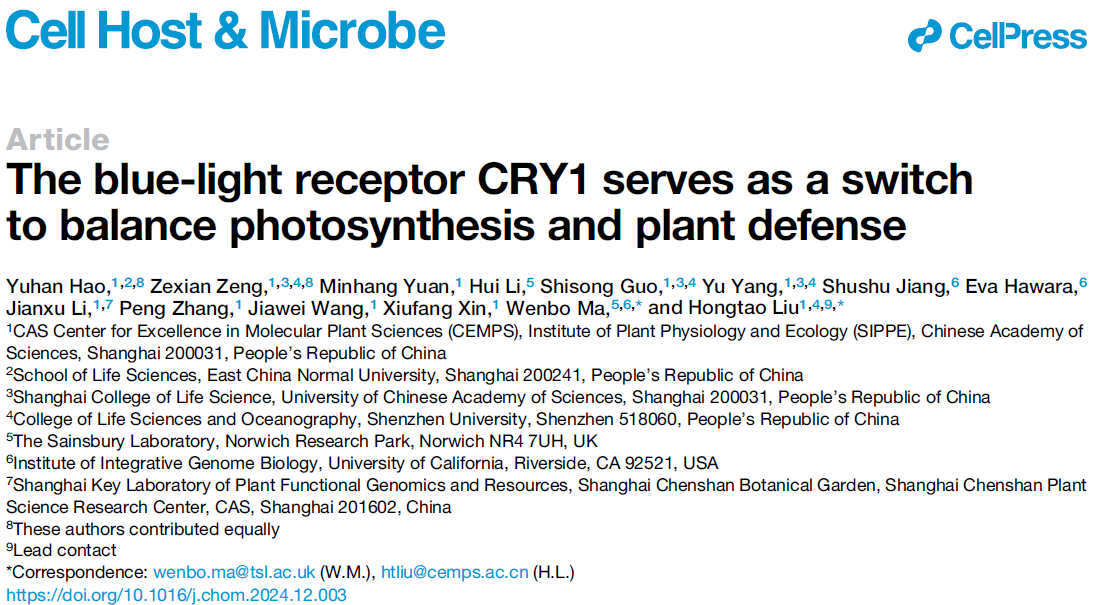 2024年12月27日,深圳大學(xué)生命與海洋科學(xué)學(xué)院劉宏濤教授團(tuán)隊和英國The Sainsbury Laboratory(TSL)研究所馬文勃教授合作,在Cell Host & Microbe在線發(fā)表了題為The blue-light receptor CRY1 serves as a switch to balance photosynthesis and plant defense的研究論文。研究表明,擬南芥藍(lán)光受體隱花色素1(CRY1)不僅介導(dǎo)藍(lán)光打開氣孔,還能在病原菌入侵時幫助氣孔迅速關(guān)閉,參與調(diào)控氣孔免疫過程。同時,CRY1還調(diào)控了PTI免疫的多個方面,作為一個“雙控開關(guān)”平衡了植物的光合和免疫。