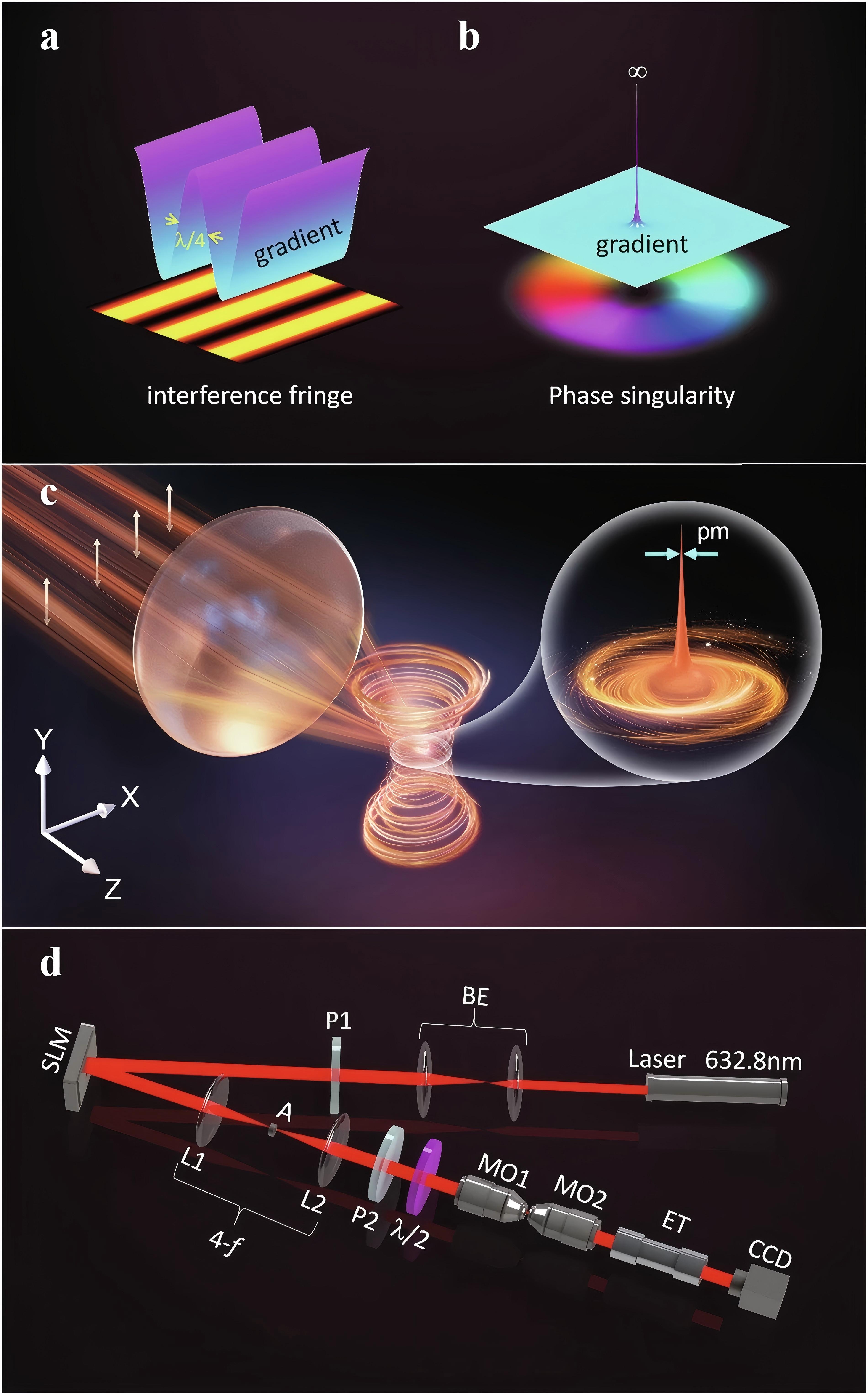 光學(xué)奇點(diǎn),作為一種具有獨(dú)特性質(zhì)的結(jié)構(gòu)光場(chǎng),近年來(lái)在精密測(cè)量、量子技術(shù)等領(lǐng)域引起了廣泛關(guān)注。傳統(tǒng)的位移測(cè)量技術(shù)受制于光學(xué)衍射極限,導(dǎo)致在皮米級(jí)精度測(cè)量中存在重大技術(shù)瓶頸。為了解決這一問(wèn)題,我校團(tuán)隊(duì)借鑒了物理學(xué)測(cè)量重心的懸掛法原理,并結(jié)合光學(xué)軌道角動(dòng)量的微觀物理圖景,提出了一種基于光學(xué)軌道角動(dòng)量的質(zhì)心法,成功實(shí)現(xiàn)了對(duì)光學(xué)奇點(diǎn)在橫向4.5 pm、縱向24.2 pm的三維皮米級(jí)精度定位。該技術(shù)通過(guò)精確觀察和分析光場(chǎng)中的微小角動(dòng)量變化,獲取光學(xué)奇點(diǎn)的位置,突破了傳統(tǒng)技術(shù)在橫向和縱向定位精度上的限制,為未來(lái)高精度三維測(cè)量技術(shù)的發(fā)展奠定了堅(jiān)實(shí)基礎(chǔ)。