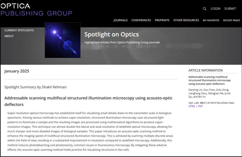 美國光學學會(Optica,原OSA),成立于1916年,有超過一百年的歷史,是光學領域權威的國際性學術組織。“Spotlight on Optics”專欄由Optica編輯團隊精選具有高創新性與應用潛力的研究成果進行專題推薦,每期刊每月僅有兩篇論文入選。此次入選標志著團隊在超分辨成像技術領域的貢獻獲得國際權威認可。此項成果為細胞器動態互作、藥物遞送機制等研究提供了重要工具,團隊將進一步探索該技術在厚組織成像與臨床診斷中的應用潛力。
