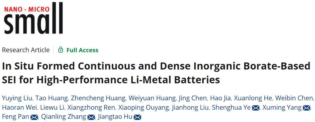 4. 深圳大學化學與環境工程學院張黔玲教授團隊在材料領域頂尖期刊Small(影響因子13.0,中科院JCR 2區,TOP期刊)發表了題為“In Situ Formed Continuous and Dense Inorganic Borate-Based SEI for High-Performance Li-Metal Batteries”的研究論文。該團隊碩士研究生劉鈺瀅為論文第一作者,張黔玲、胡江濤、楊旭明、葉盛華,潘鋒為該論文共同通訊作者,深圳大學為第一作者單位和第一通訊單位。
