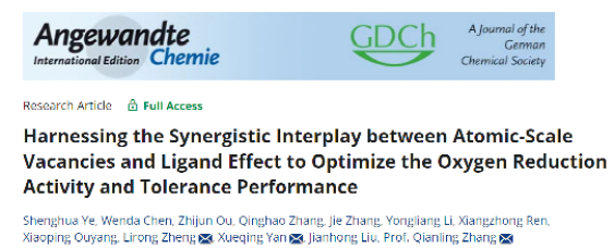 1、深圳大學張黔玲教授團隊在期刊Angewandte Chemie Internatioal Edition上發表題為“Harnessing the Synergistic Interplay between Atomic-Scale Vacancies and Ligand Effect to Optimize the Oxygen Reduction Activity and Tolerance Performance”的研究論文,該論文并被評為Hot paper。共同第一作者為葉盛華研究員以及陳文達碩士,張黔玲、劉劍洪,北京大學教授顏學慶以及高能所研究員鄭黎榮是共同通訊作者。