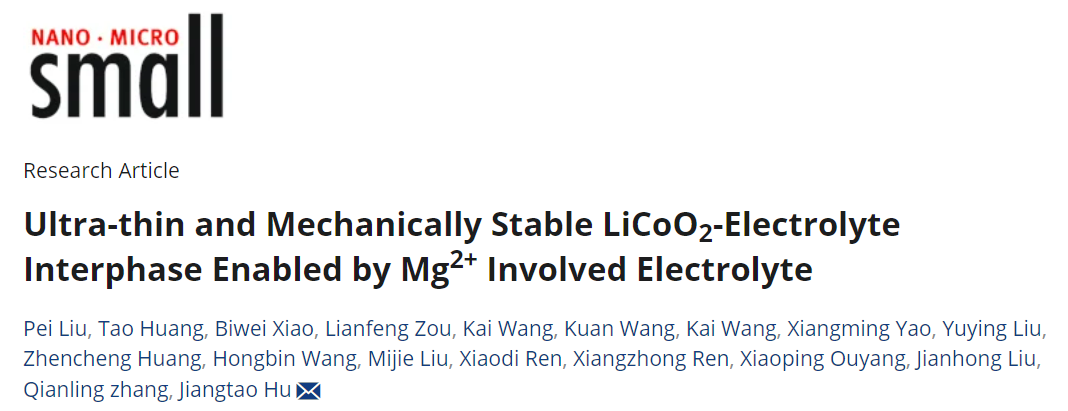 5. 深圳大學化學與環境工程學院張黔玲教授團隊在材料領域頂尖期刊Small(影響因子13.0,中科院JCR2區,TOP期刊)發表了題為“Ultra-thin and Mechanically Stable LiCoO2-Electrolyte Interphase Enabled by Mg2+ Involved Electrolyte”的研究論文。該團隊碩士研究生劉珮和黃濤為論文共同第一作者,深圳大學胡江濤副教授為該論文通訊作者。