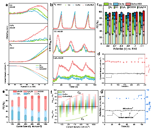 利用蒸鍍策略首先在Cu催化劑層表面構建孤立的Au位點,以增強Cu催化劑的本征活性;然后通過Au-S鍵將己硫醇(HEX)分子固定在Au位點上,以調節反應微環境。Au/Cu雙金屬活性位點降低了C-C偶聯過程的能壘,加速了多碳產物的生成。Au位點上穩定且非致密的HEX分子修飾層,可以保證催化界面的疏水性,同時確保反應物與*CO關鍵中間體的傳輸通道。因此,該催化劑即使在安培級電流密度下,多碳產物的法拉第效率也能達到70%以上,且能保持長時間的穩定性(圖4)。