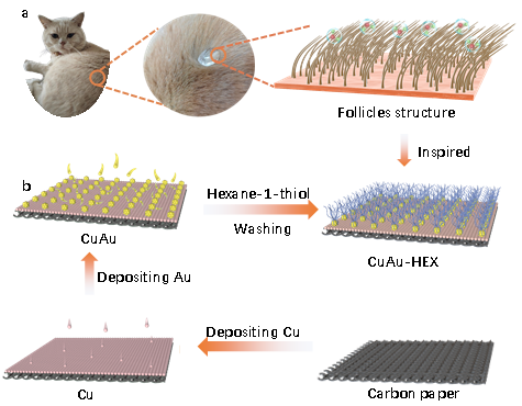 CO2電化學還原(CO2RR)是一個涉及到多電子與多質子轉移的復雜反應,且主要過程均發生在氣體-電極-溶液組成的三相界面上,界面微環境的性質會直接影響CO2RR反應路徑與催化效率。因此,在反應界面構建高效活性位點和調控有利的局域微環境同樣重要。本研究基于動物疏水透氣的毛囊結構,提出了一種仿生策略,在一個體系中同時解決這兩個問題(圖3),獲得高活性和高選擇性的CO2RR電催化劑。