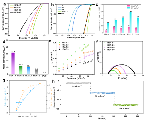 利用MOFs和聚合物纖維的限域效應,成功合成尺寸可調的高熵納米合金,實驗室條件下可一次性制備約400 cm2。HEA納米顆粒均勻限域在多級孔碳纖維載體上,其平均直徑為1.7、2.3、3.0和3.9 nm。較小的HEA納米顆粒具有較低的功函,促進電子從催化材料表面轉移到反應中間體,加快整體反應動力學。此外,其多級孔碳纖維載體,可以暴露更多的活性位點,大大提高貴金屬的質量活性(圖2)。
